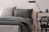 Modern quilt in a classic, white-stitched subdued BRICK pattern in a pillowy, lightweight quilt with linen/cotton blend cover and polyfill. Brick masonry — the weighty architectural building blocks of both urban and rural foundations — gets an airy makeover.