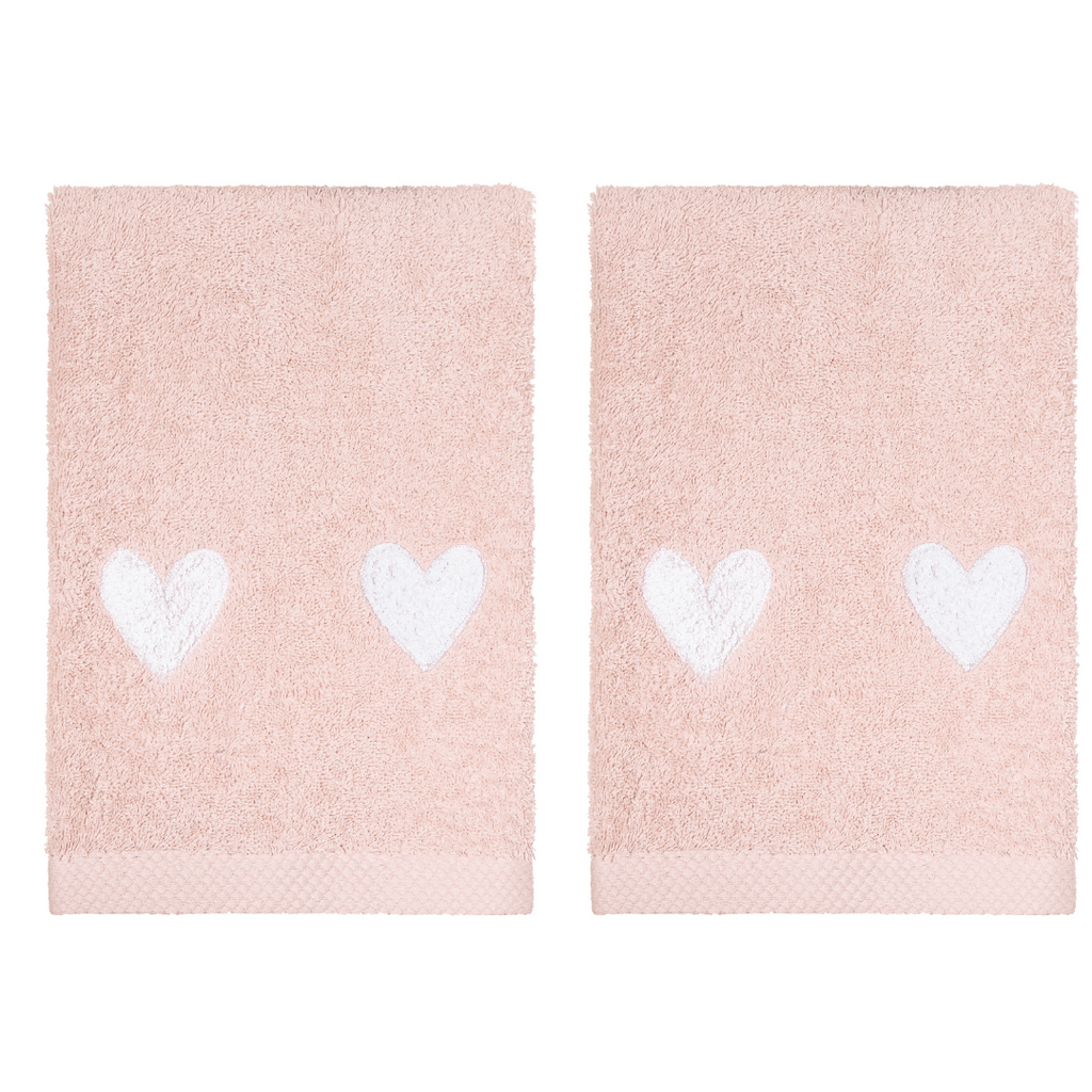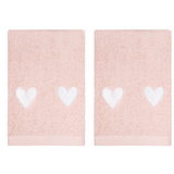 White embroidered hearts on pink terry cloth guest towels. $75 per pair.