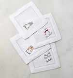 Our Cheers cocktail napkins are meant to keep the conversation as free-flowing as the libations. Refined white hemstitched linen is embellished with playful, colorful embroidery: a cheerful selection of four drinks, each with its own worldly toast to the occasion.