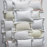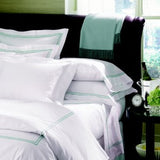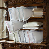 These linens are styled after those that grace the beds of some of the finest hotels in the world. So if you're wondering why you always sleep so well in a five-star hotel, this may be the answer. This ever-popular percale is embroidered with tailored double-rows of satin stitch in colors numerous enough to thrill a decorator. Plus, they're woven by our masters in Italy to last through many washings. 220 thread count percale with double row of satin stitch embroidery.