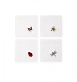 Insetti is our delightfully animated cocktail napkin with the most endearing insects embroidered on fine, white hemstitched linen to add energy and whimsy to your table.