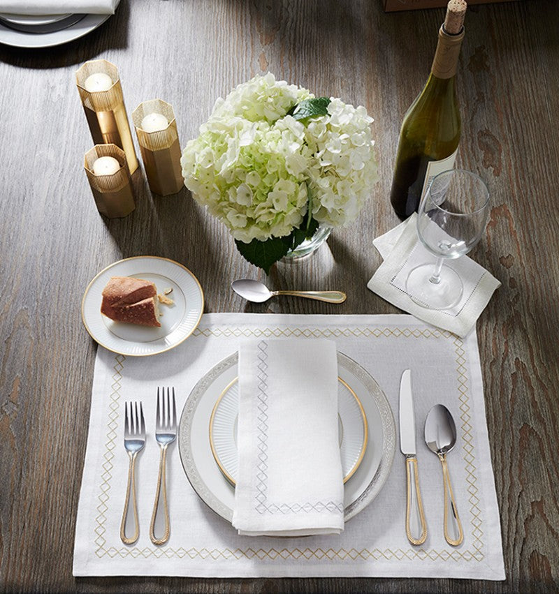 Perry takes our pure white Festival linen and embellishes it with an embroidered diamond border for a light touch of color and design.