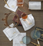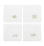 Our Royalty cocktail napkins elevate any celebration: pure white hemstitched linen is embroidered with one of four gold crowns–a graceful, whimsical way to break the ice. They’re ideal as gifts, or to make your own guests feel like royalty.