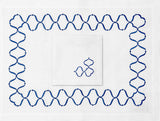 White linen placemats and matching napkins. Blue embroidery on white linen.
