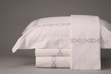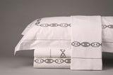 In stock as a complete King bed set in charcoal grey embroidery on white 300 thread count cotton percale. Set includes 1 top sheet, 1 bottom sheet (Cal or Eastern King available), 2 King pillowcases, 2 king pillow shams, and duvet cover.