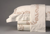B 13 a classic Italian hand embroidered “leaves” design. Two colorways make this classic one of a kind. In stock as a complete Queen bed set in luxurious 600 thread count ivory sateen with red and cream colored embroidery. Queen set includes duvet cover, flat sheet, fitted sheet, and 4 queen shams. Duvets have mother of pearl button closure. Other sizes and colors available as a custom order. 6-8 week lead time for all custom orders.