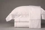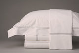 It’s clean lines and polished versatility can match traditional to modern style bedrooms. King set available in crisp 300 thread count white percale framed with 2 rows of camel colored hemstitch. Set includes flat sheet, fitted sheet (cal or eastern king available), 2 king shams, and duvet cover. Duvets have mother of pearl button closure. Other sizes and colors available as a custom order. Custom orders require a 6-8 week lead time.