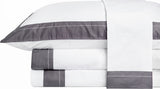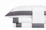 This polished design is available in crisp percale 480 thread count white, finished with a 4 inch cotton border with hand stitching.